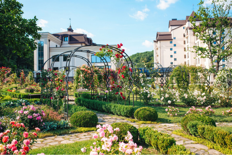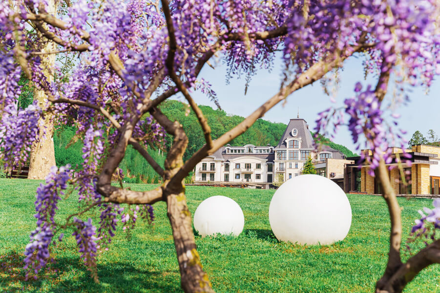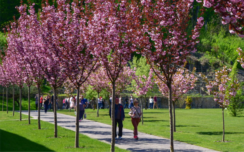 Перші квіти з'являються в березні - гамамелис, крокуси, шафран. У квітні - пік цвітіння: різними відтінками грає сакура (14 сортів), декоративні яблуні, настає час магнолії. У травні зачаровує долина ірисів (180 сортів). Останній місяць весни дарує бузок (14 сортів), рододендрони (43 види і сорти), півонії деревовидні, а глициния створює візерунок навколо берсо. Весна залишає літа й осені розкішний розарій з тисячею троянд 150 сортів. Рожева арка стає неймовірно романтичним місцем.