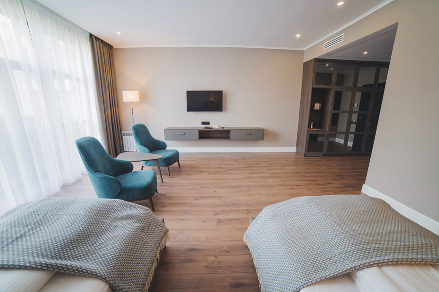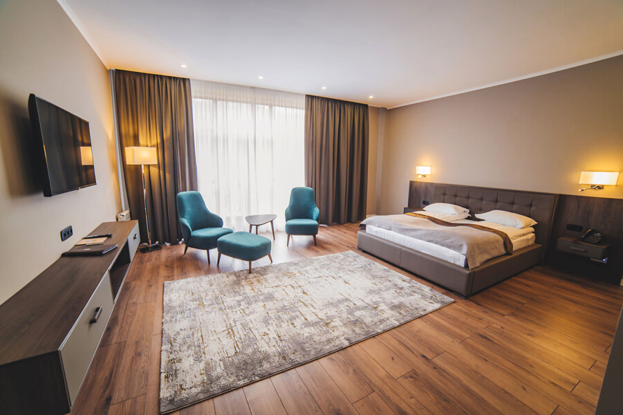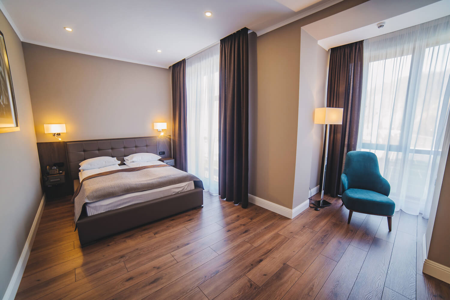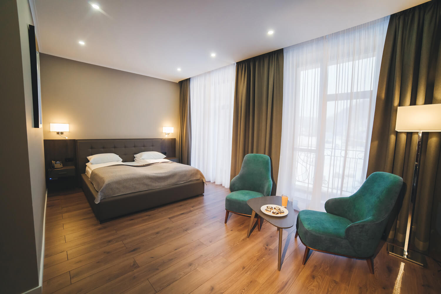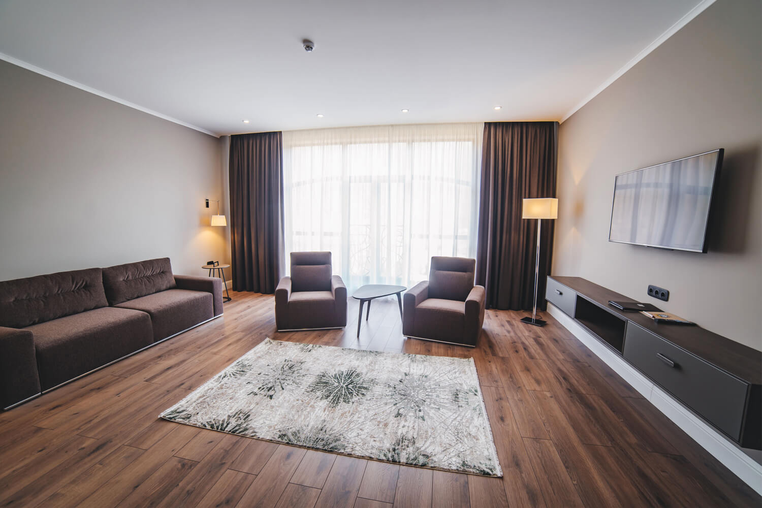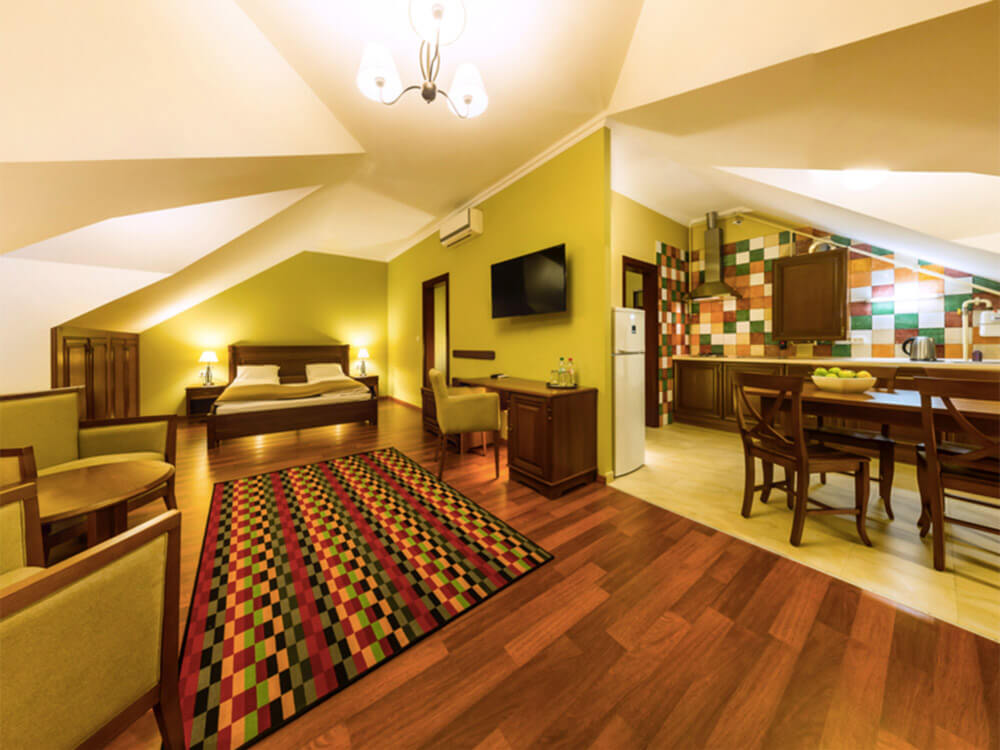 Апартамент-готель пропонує 44 комфортабельних апартаментів для розміщення гостей. Номери відрізняються площею та дизайном, а функціональність і концептуальний стиль об'єднують їх. Вони просторі і світлі, з характерними елементами дизайну. Різноманітність категорій апартаментів дасть можливість вибрати номер, найбільш відповідний меті Вашого візиту. Апартаменти розташовані на відстані 5-7 хв ходьби до основної території Санаторного Комплексу «Деренівська Купіль».