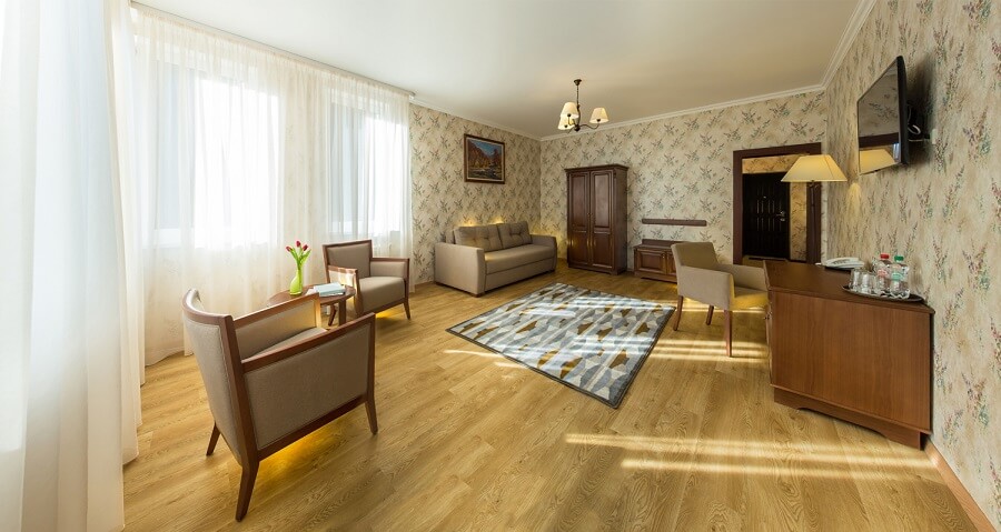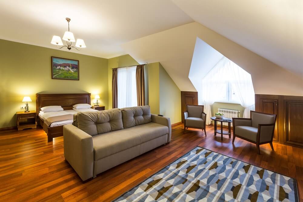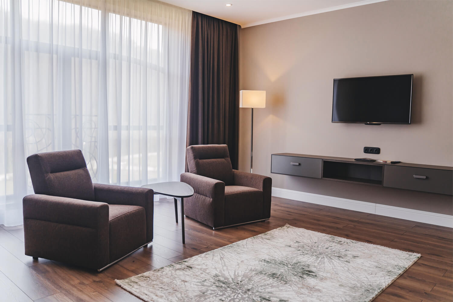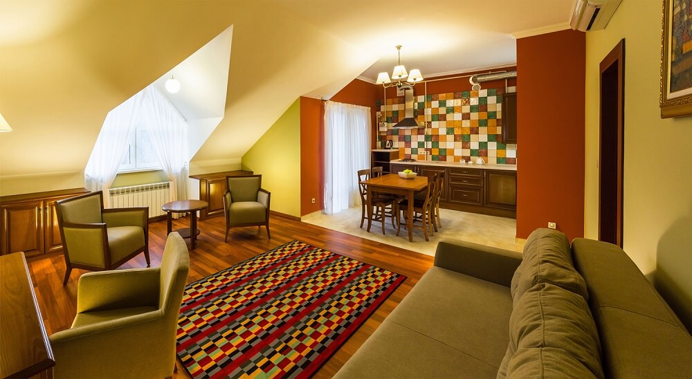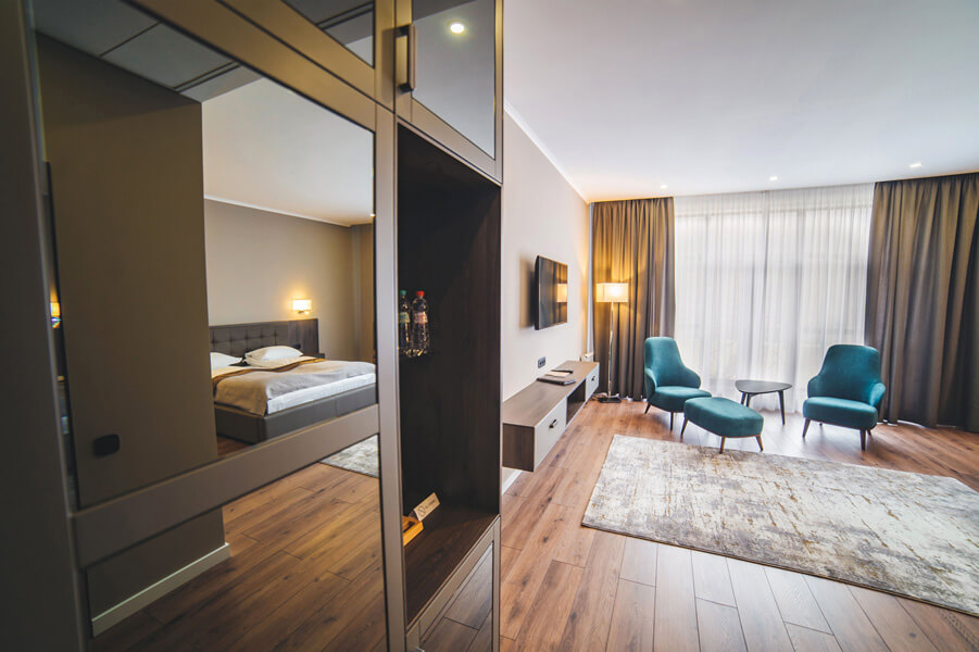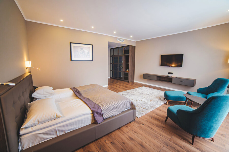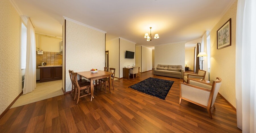 Апартамент-готель пропонує 44 комфортабельних апартаментів для розміщення гостей. Номери відрізняються площею та дизайном, а функціональність і концептуальний стиль об'єднують їх. Вони просторі і світлі, з характерними елементами дизайну. Різноманітність категорій апартаментів дасть можливість вибрати номер, найбільш відповідний меті Вашого візиту. Апартаменти розташовані на відстані 5-7 хв ходьби до основної території Санаторного Комплексу «Деренівська Купіль».