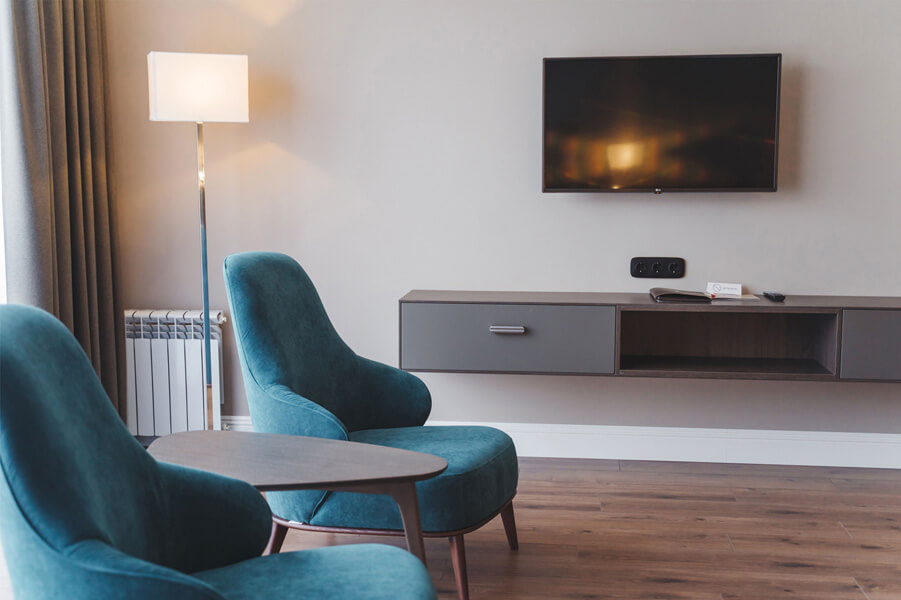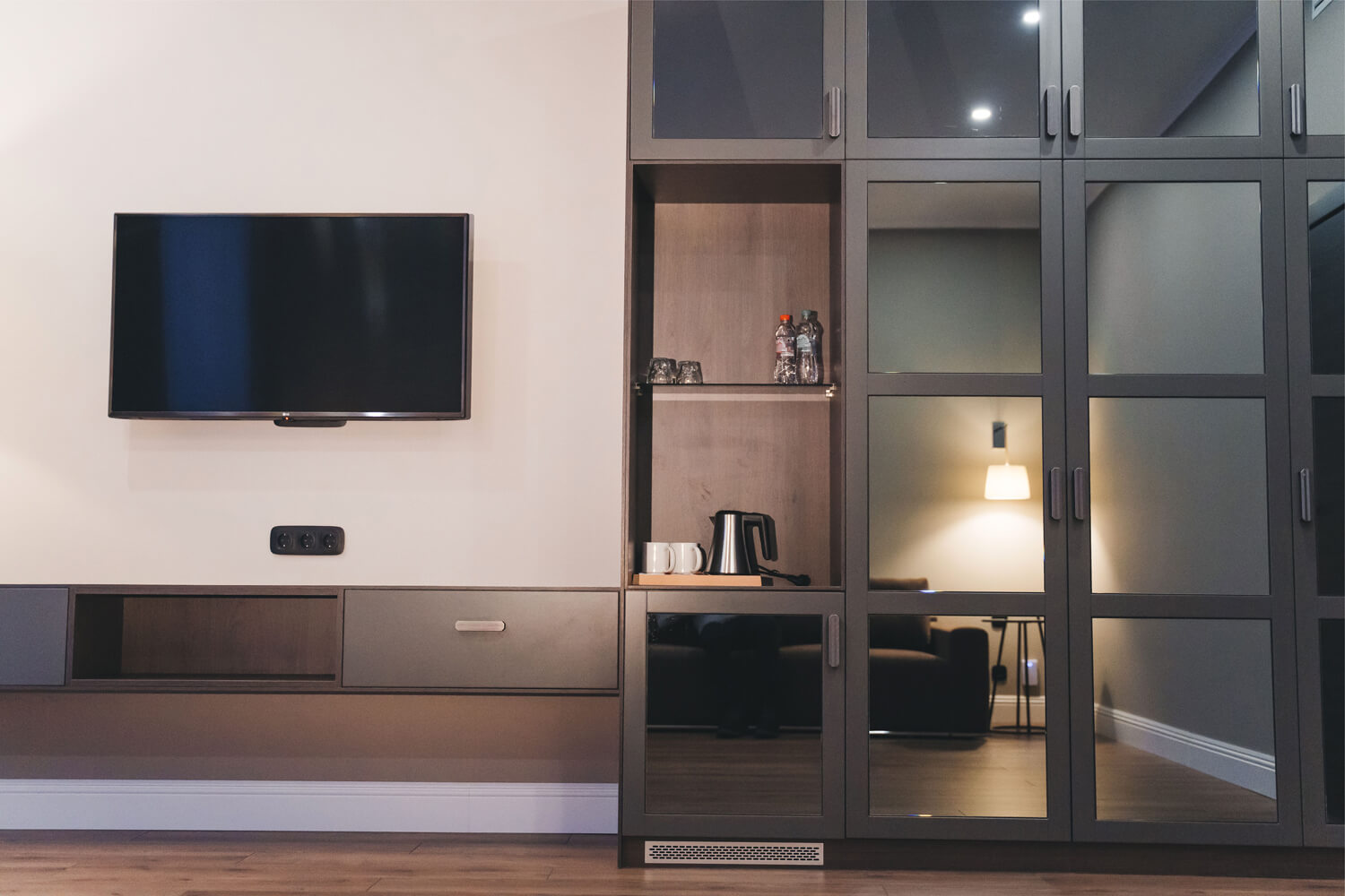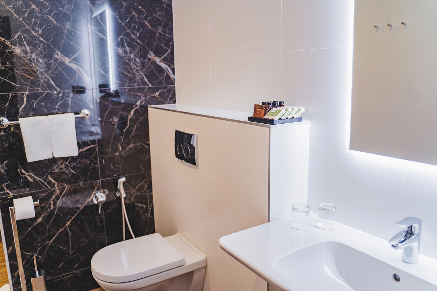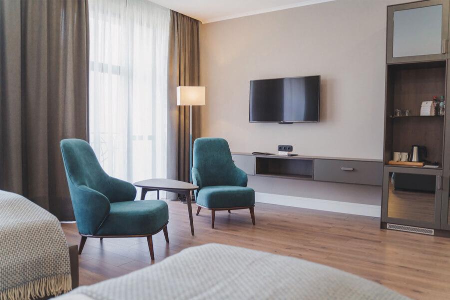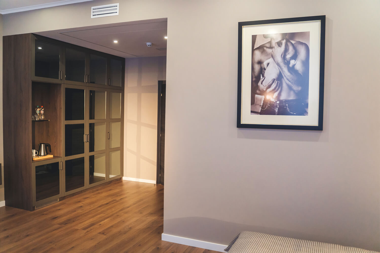 Апартамент-готель пропонує 44 комфортабельних апартаментів для розміщення гостей. Номери відрізняються площею та дизайном, а функціональність і концептуальний стиль об'єднують їх. Вони просторі і світлі, з характерними елементами дизайну. Різноманітність категорій апартаментів дасть можливість вибрати номер, найбільш відповідний меті Вашого візиту. Апартаменти розташовані на відстані 5-7 хв ходьби до основної території Санаторного Комплексу «Деренівська Купіль».