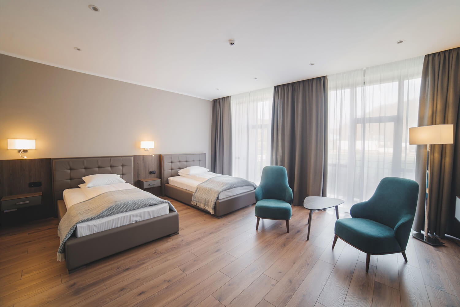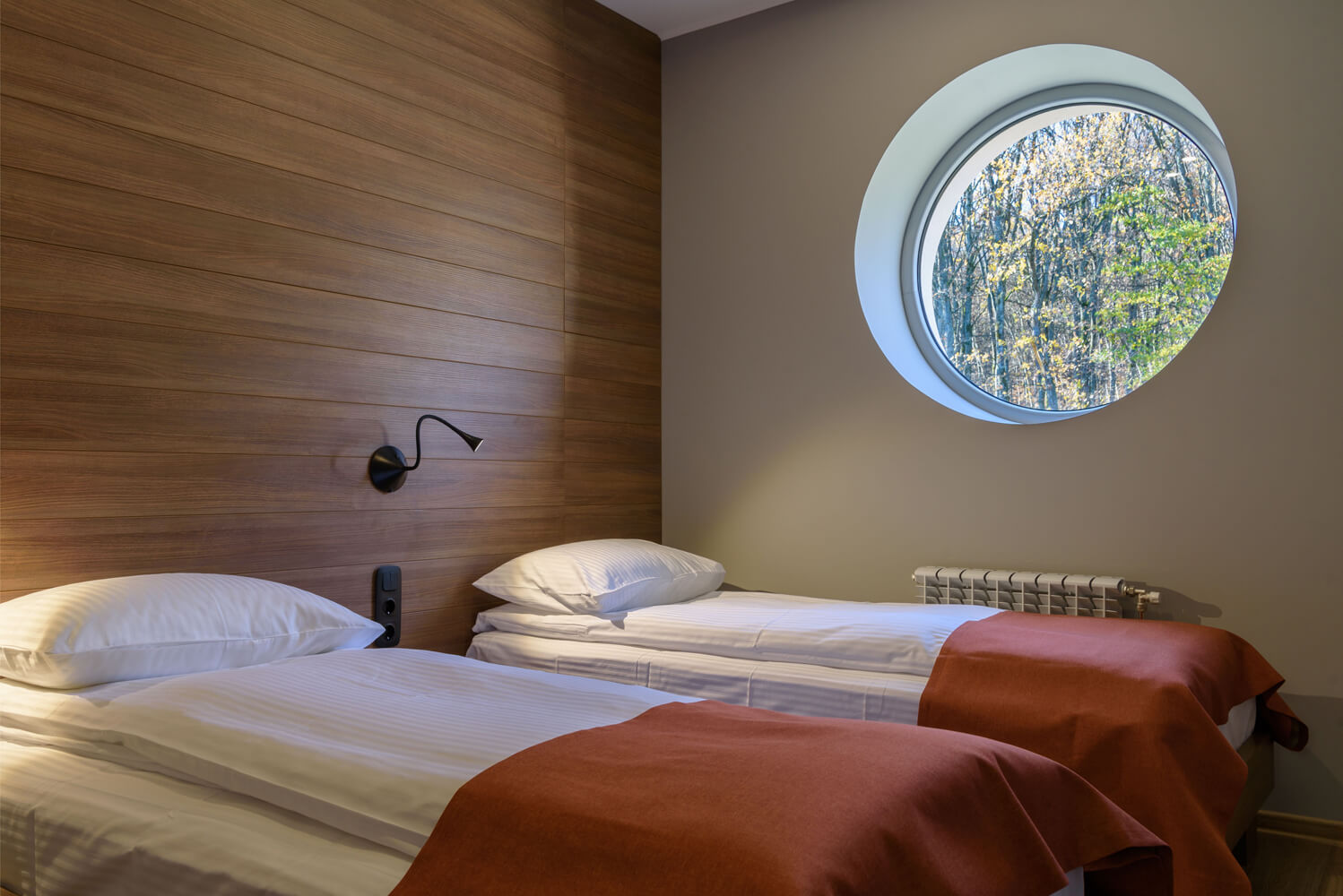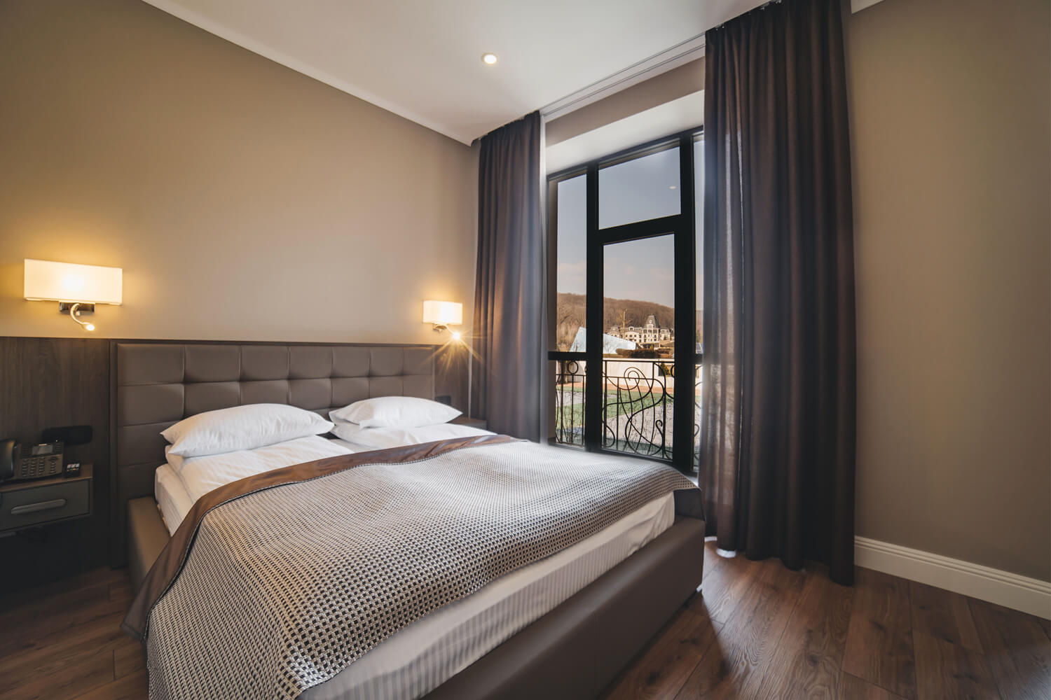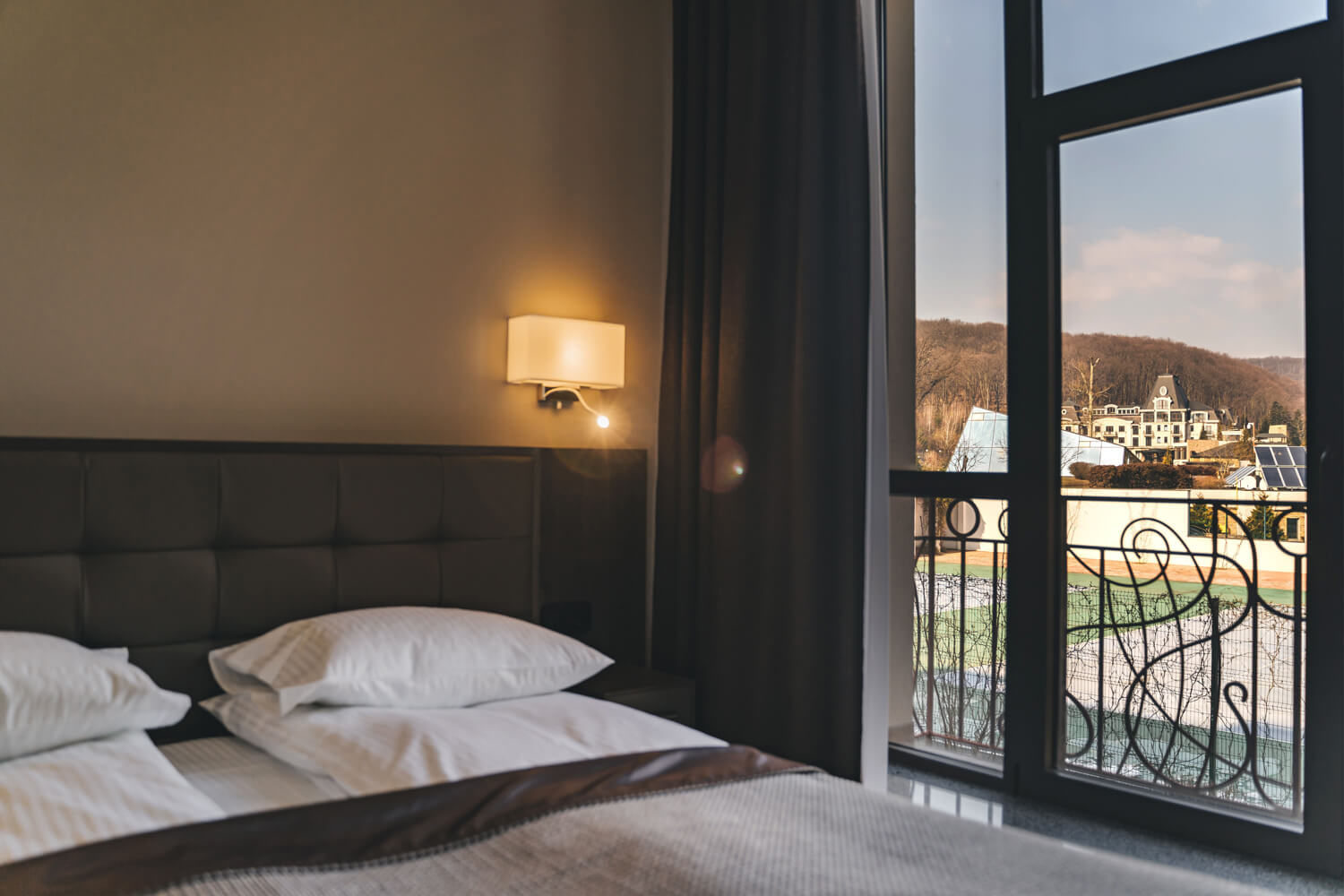 "Ірис" - сучасна європейська готель на 130 номерів різних категорій. В інтер'єрі поєднуються стиль мінімалізм, естетика лаконічних елементів і стримана елегантність. Природне освітлення створює затишок, а панорамні вікна відкривають пейзажі Деренівська Купелі.